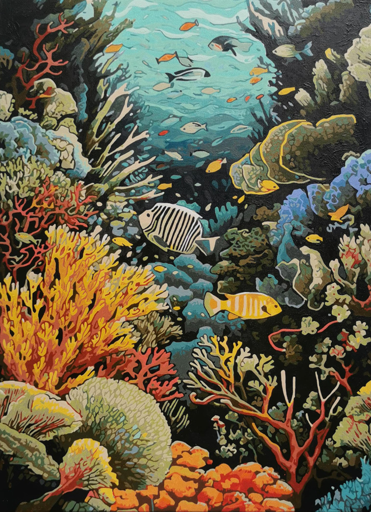 ARTIST STATEMENT: Tiger sharks love to eat. They love to eat so much that they are deemed the "garbage cans of the sea." However, their large appetites help their seagrass ecosystems, as they eat animals who, if left unattended, could overgraze seagrass beds and destroy the ecosystem. They also hunt predatory fish, which allows populations of herbivorous fish that manage algae populations to thrive. The shark in the painting swims along peacefully, looking for its next meal, unaware of its impact on the ecosystem. Behind it, there is a thriving, bright ecosystem that it unknowingly helps create. The area in front of the shark is dark, dull, and lacking life. The crumbling rocks and gloomy environment show how the seagrass ecosystem would collapse without the tiger shark. Where the tiger shark has ventured, there is life and light, and without it, the ecosystem is dark, dull, and dead.