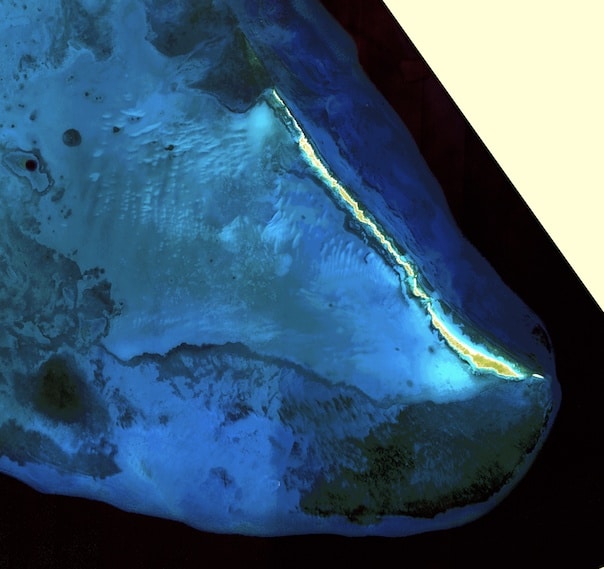 Yes, we start with hi-resolution imagery of the area that’s gathered by the WorldView-02 satellite, and then we compare the features in the satellite images with the video, digital photos, and depth soundings we are gathering here on Cay Sal Bank. What’s cool about what we’re doing is that we’re using this new satellite on a scale that hasn’t been used before, so we’re very much pushing the edge of what can be done with it. WorldView-02 is a relatively new satellite and offers a lot more spectral information than previous satellites, so instead of getting the standard red, green, blue channels like your digital camera (and previous satellites), we have four more channels of data to work with. We hope all that spectral information will improve our ability to develop better habitat maps. WorldView-02 also has a finer spatial resolution than previous satellites with each pixel covering a two-meter by two-meter area. With the satellite imagery, we will map a very large spatial extent (about 6,000 sq. km.), which really is an enormous coverage.