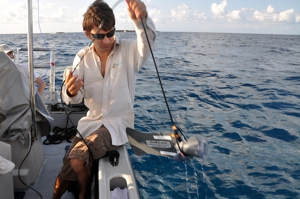 Sure, I’m a research assistant and a Ph.D. student in the National Coral Reef Institute housed at Nova Southeastern University’s Oceanographic Center and I work with Dr. Sam Purkis in the Remote Sensing Lab. Dr. Purkis has been working with the Living Oceans Foundation for several years now, and I became a Living Oceans Fellow in 2010. Our research here on Cay Sal Bank focuses on the collection of ground-truth information for the creation of benthic habitat and bathymetric maps. Essentially, we are trying to map the landscape of the bank using satellite imagery and the information we gather here in the field.