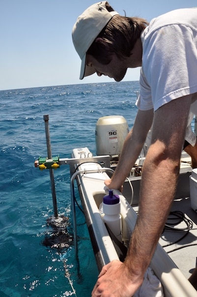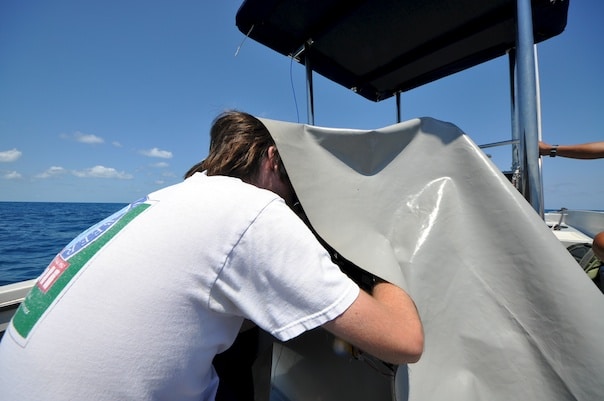 Well, from the satellite imagery we’re able to see different landscape patches on the bank, so each day we visit these patches in the small catamaran to find out what is actually present in the patch. At each of these locations, we drop a video camera over the side of the boat on a long cable where it captures 30-60 seconds of video of the seafloor. We can then compare what we’re seeing on this drop-cam to the spectral imagery from the satellite. So, far on this expedition, we’ve collected video at 375 separate survey sites.
