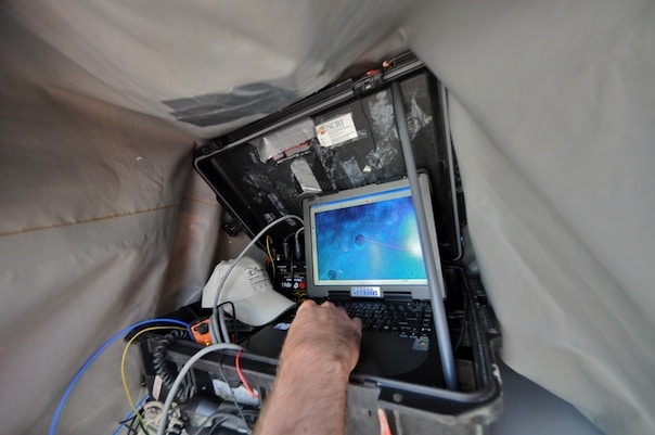 We have another similar tool called Stratabox. It’s similar to the Hydrobox in that it’s also an acoustic sounder, but it emits a more powerful ping at a lower frequency. Because of its power, the ping is able to penetrate through the soft sediments on the seafloor, like sand and mud, and the sensor is able to detect the reflection off the hard surface under the sediments. This hard surface is typically from the Pleistocene era and has been here for thousands of years, so we’re able to see how much sand has gathered here over the last 10,000 to 12,000 years. On this particular expedition, we’ve been using the Stratabox to look at the sinkholes that are all over Cay Sal Bank. We’re interested to see how the holes form, how much and what types of sediment have filled in these holes, and to understand the dynamics of the holes over long time scales. There are some really interesting patterns we’re seeing from the satellites related to these blue holes, so we’re gathering as much information about them as possible.