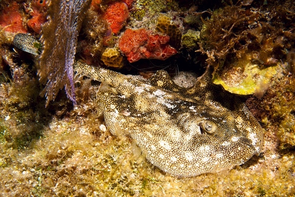 This is a Yellow Stingray that our divers have been reporting seeing occasionally. Everybody had seen them except me thus far, so this is the first one that I finally got to see on this trip! One of the groups that I work with on fish surveys is the Reef Environmental Education Foundation (REEF) and the yellow stingray is one of the species they have been tracking. We don’t know why yet, but the overall sighting frequency – the percentage of dives on which you might expect to see this species – has been steadily decreasing over at least the last decade. So, something is impacting them because we’re seeing less and less of them. We’ve figured out the ‘what’ but we haven’t figured out the ‘why’ yet.
