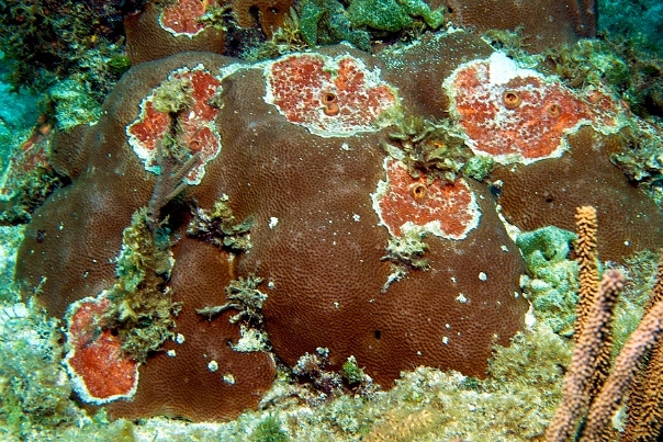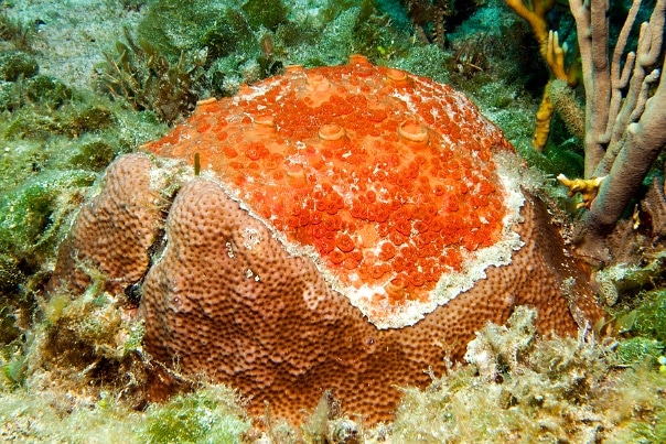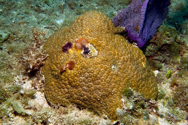 This here is a larger Siderastrea colony with six separate infestations of the sponge that you see as bright red circular patches.