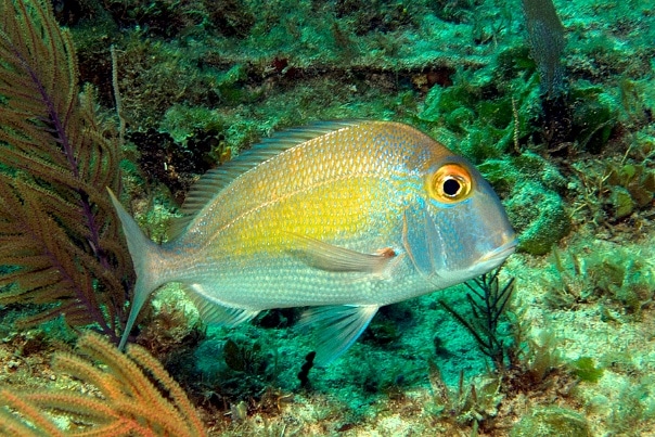This is a species of fish called a Sheepshead Porgy. The distinctive feature on him is that upper lip overlaps the lower by a bit and there is a little itty-bitty dark spot on the top of his pectoral fin. That’s how you can tell him apart from another porgy called the Saucereye Porgy who’s also got a blue line underneath his eye. We’re interested in several of the porgy species because they are predators of the longspined urchins called Diadema which are important herbivores on the reef.