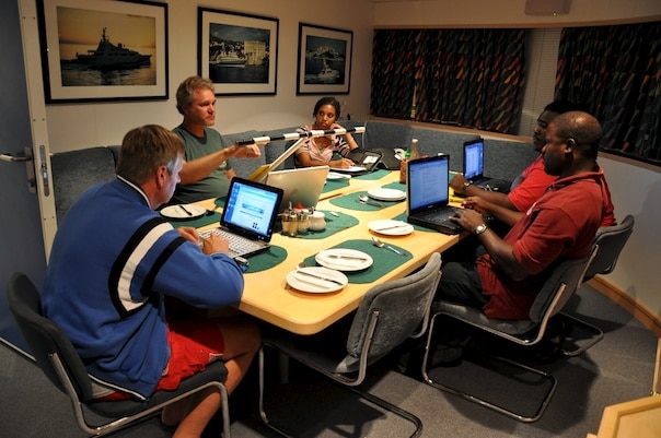 Once in Freeport, we said hello to our new marine scientists shipmates as they came aboard. We now have Tavares Thompson from the Bahamas National Trust and Bahamian students Alannah Vellacott and Alexio Brown aboard. They’ll be joining our survey teams on our afternoon dives tomorrow. AGRRA data manager Ken Marks and Dave Grenda from the Reef Environmental Education Foundation (REEF) briefed the new team members this evening on coral and fish survey techniques, so they’ll be ready to dive right in.