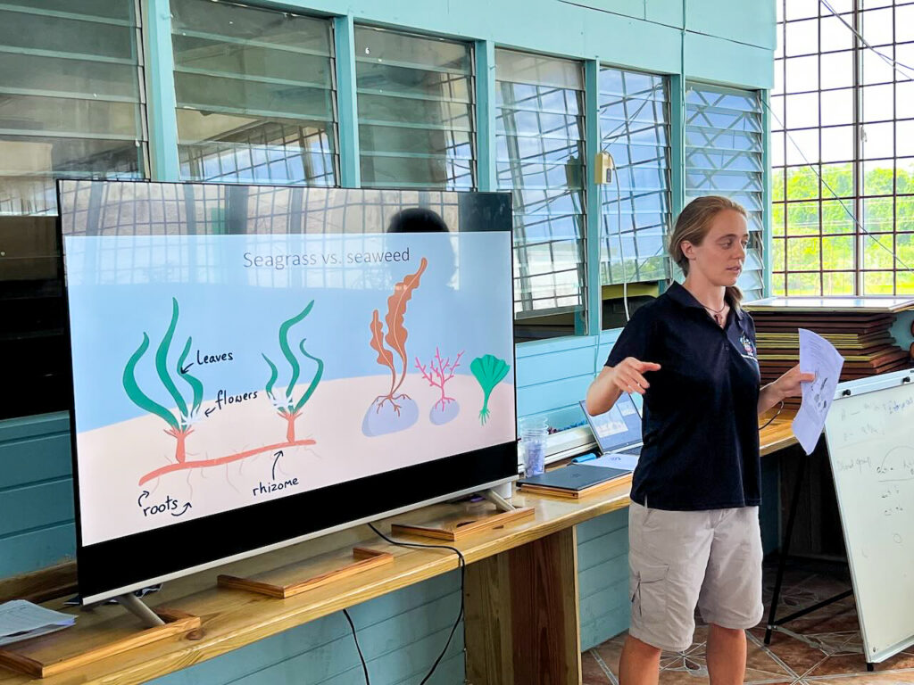 Though we only had a brief chance to chat in passing, we stayed in touch after returning to our respective countries. That’s when I learned more about her PhD research on seagrass biodiversity and that she was required to complete an internship as part of her program. Isabel wanted to do something different, something hands-on and impactful. I shared with her that it had been a long-held dream of mine to create a seagrass curriculum and program that mirrored the success of our J.A.M.I.N. program. Adding seagrass would complete the trifecta of tropical marine ecosystems: coral reefs, mangroves, and seagrasses.