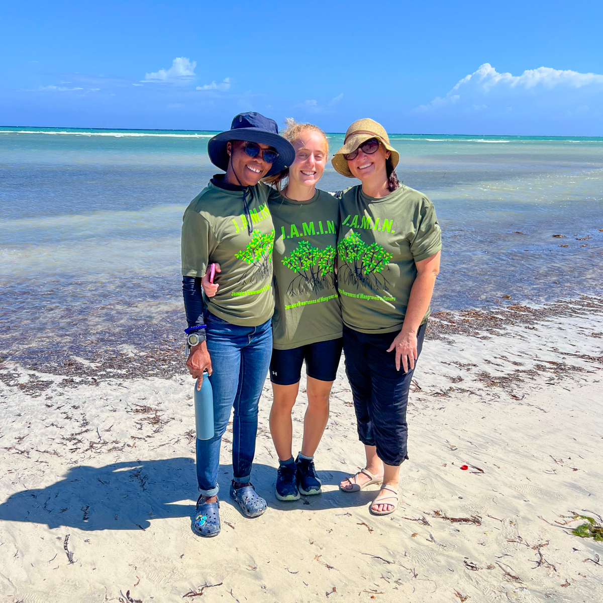 Isabel Key (center) with her internship mentors: Shanna Thomas, Chief Scientific Officer at the University of the West Indies Discovery Bay Marine Laboratory (left) and Amy Heemsoth, COO & Education Director of the Khaled bin Sultan Living Oceans Foundation (right).