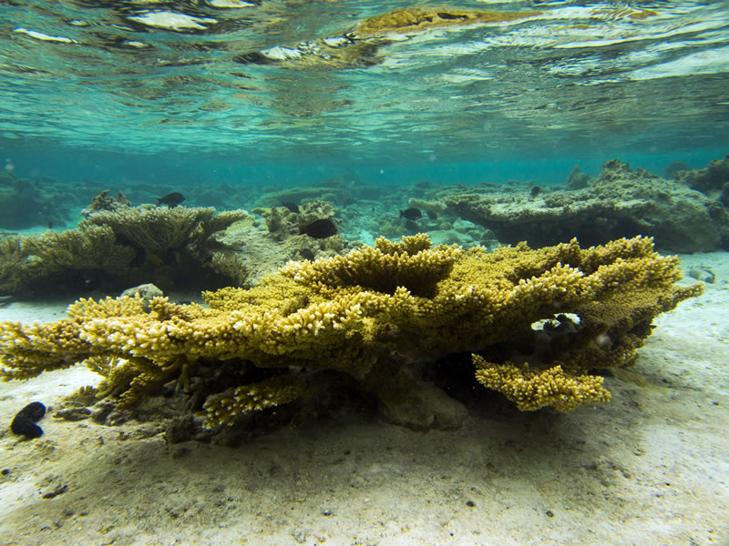 When our science team first surveyed Aitutaki’s reefs in 2013, large numbers of starfish were seen moving in a drove across the reef, much like a spreading forest fire, eating nearly every coral in their path. Hundreds of starfish progressively worked their way along the leeward (western) side of the fore reef, beginning near the northern tip of the atoll, and reaching the south coast two years later. A second group moved along the east coast, working their way towards the southeastern tip. The highest numbers of animals were concentrated in shallow water (3-5 m depth) among virtually the only remaining healthy stand of branching and digitate acroporids. In the surrounding area, slightly deeper (5-30 m depth), and in all fore reef environments north of the outbreak more than 95% of the preferable species of corals had been eaten.