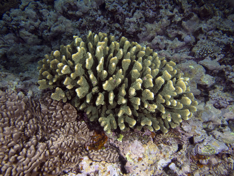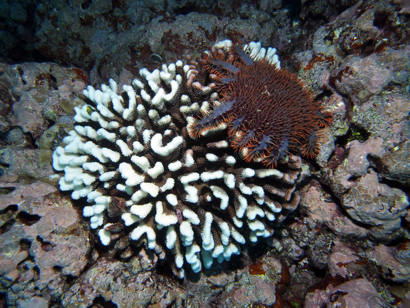 Sadly, live coral cover on the outer reefs had been reduced from 30-80% (depending on depth) to 1-2% or less. The only exceptions were some of the deeper areas that contained species the starfish rarely ate (Porites rus), and a few larger colonies of Pocillopora eydouxi, digitate acroporids and about 30% of the larger Porites lobata. They tend to eat the species of cauliflower coral (Pocillopora) and branching acroporids that have small branches, because it is easy for them to extend their stomach around these corals, but the corals with longer and larger, more closely spaced branches were harder to eat and often they only consumed the branch tips.