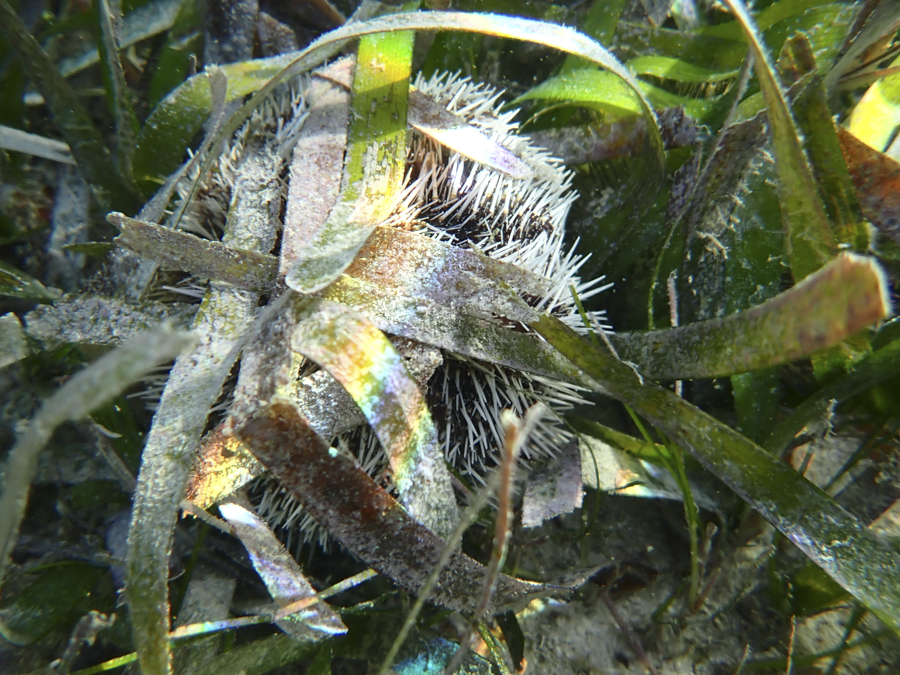 Other species come for a very different reason—seagrass itself is on the menu! Seagrass happens to be the favourite food of some of the graceful giants of the Caribbean—green sea turtles and manatees, as well as certain fish species that feed directly on the blades. Small animals like sea urchins and snails also graze in seagrass meadows, but primarily eat algae from the surface of the leaves, keeping the seagrass healthy so it can continue to grow.