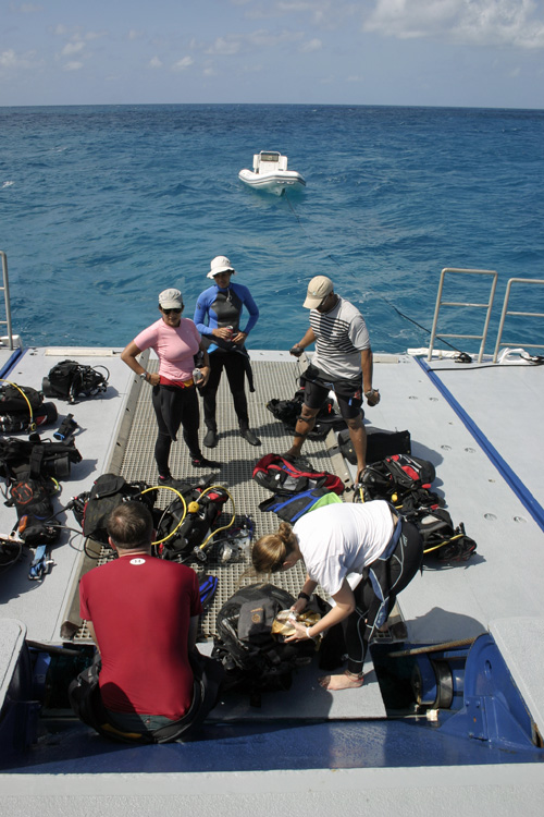 This morning, Dive Safety Officer Nick Cautin organized a “shakedown dive”. After lunch, the Calcutta dive boat took everyone out for some real work: the coral survey team, the benthic cover team (focusing on the bottom), two fish survey teams, one group looking at large mobile invertebrates like conch and lobster, another focusing on plankton communities, and finally Steve Schill of The Nature Conservancy and his fancy sidescan sonar (more on that later.) Captain Phil Renaud, Executive Director of the Living Oceans Foundation, helped with photo transects.