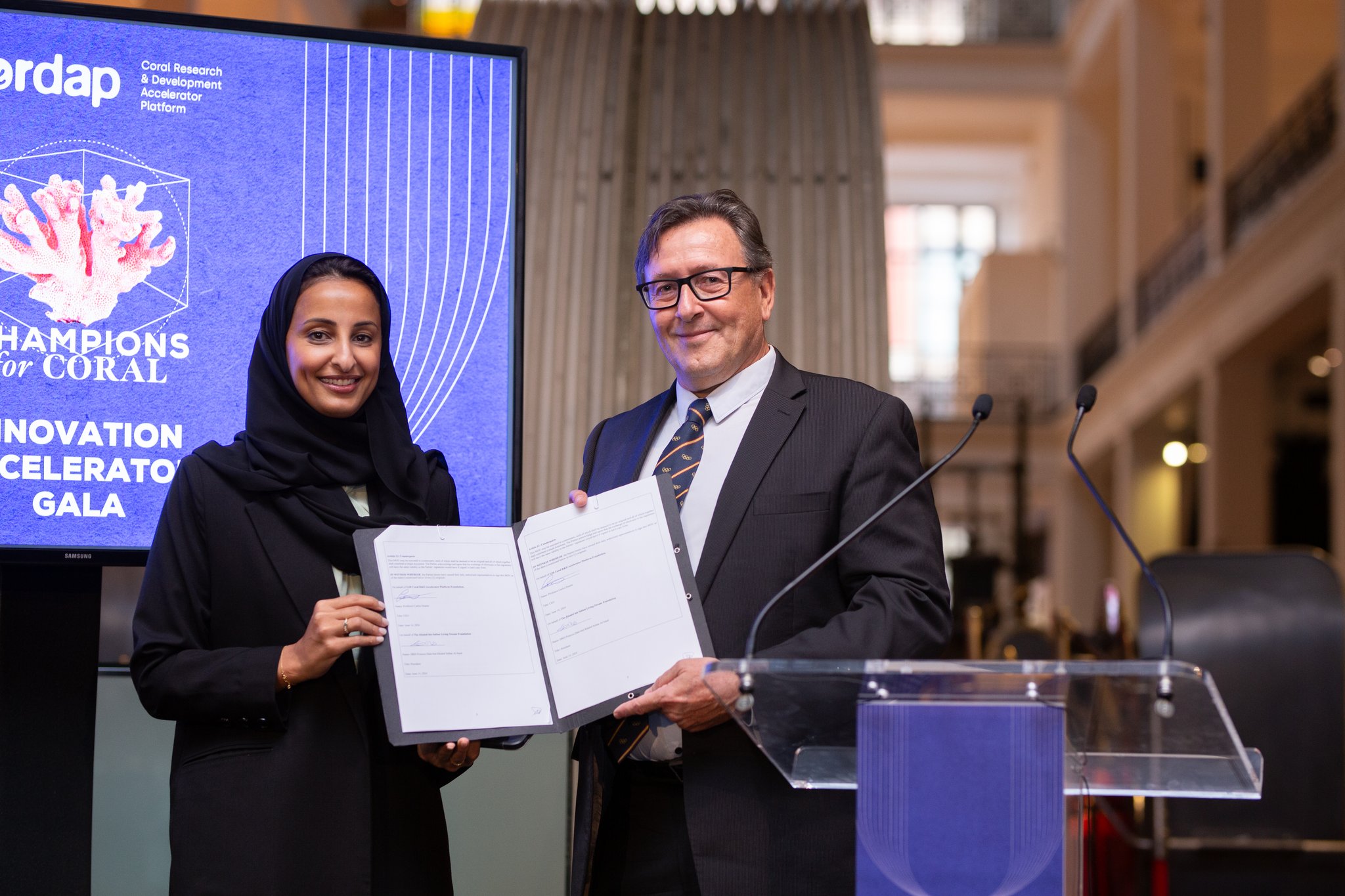 The Khaled bin Sultan Living Oceans Foundation (KSLOF) signed a Memorandum of Understanding with the Coral Research and Development Accelerator Platform Foundation (CORDAP). This formal agreement was signed by HRH Princess Hala bint Khaled bin Sultan, President of KSLOF, and Professor Carlos Duarte, the CEO of CORDAP Foundation, during the Champions for Coral Innovation Accelerator Gala held at the Science Museum in London.