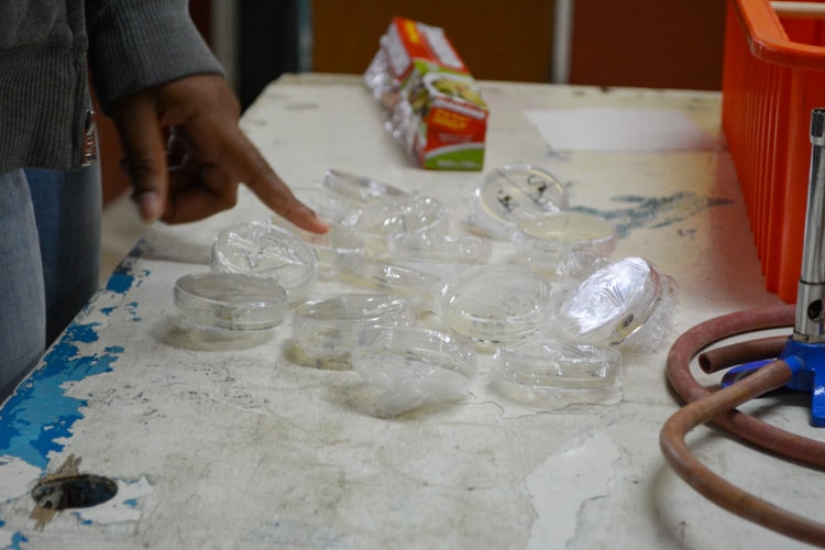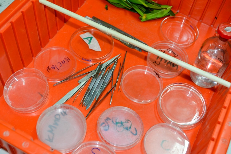 We passed out the supplies needed for the activity while the laboratory technician lit the gas flames needed to sterilize the equipment. The students carefully begun cutting the necrotic and healthy tissue from the mangrove leaves that they collected during the field trip. The students then sterilized their tools as the freshly cut leaf fragments were placed in bleach solution to rid them of contaminants. One by one, the students removed the fragments from the solution using the sterilized utensils. With careful precision, they placed the fragments in their agar petri dishes while making sure not to contaminate their samples. Now, all the students had to do was wait for their cultures to grow.
