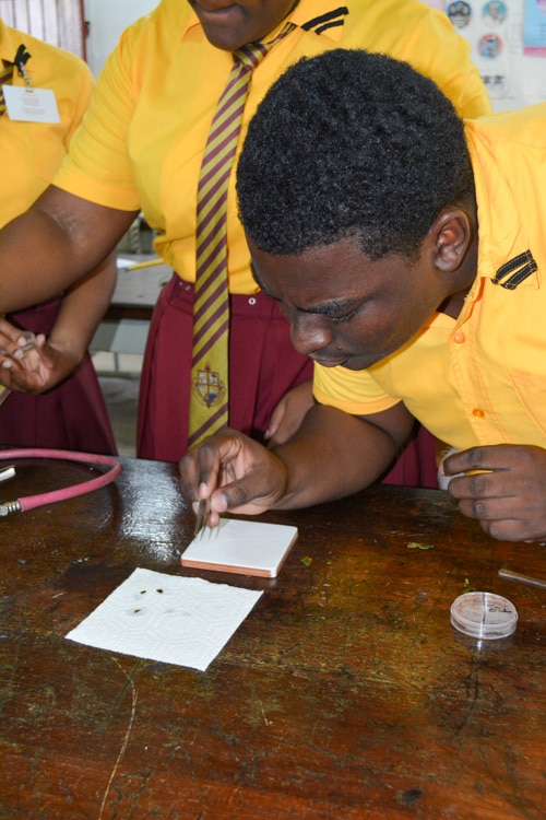 There were several steps that students executed before they can determine whether the disease-causing fungus, Pestalotiopsis, was present in their samples. Although Jamaican students learn about disease as a part of their Biology syllabus, much of the information that they needed to conduct this investigation was new. With our partners at Alligator Head Foundation, we first provided a lecture about plant disease and demonstrated how to conduct the first part of the investigation.