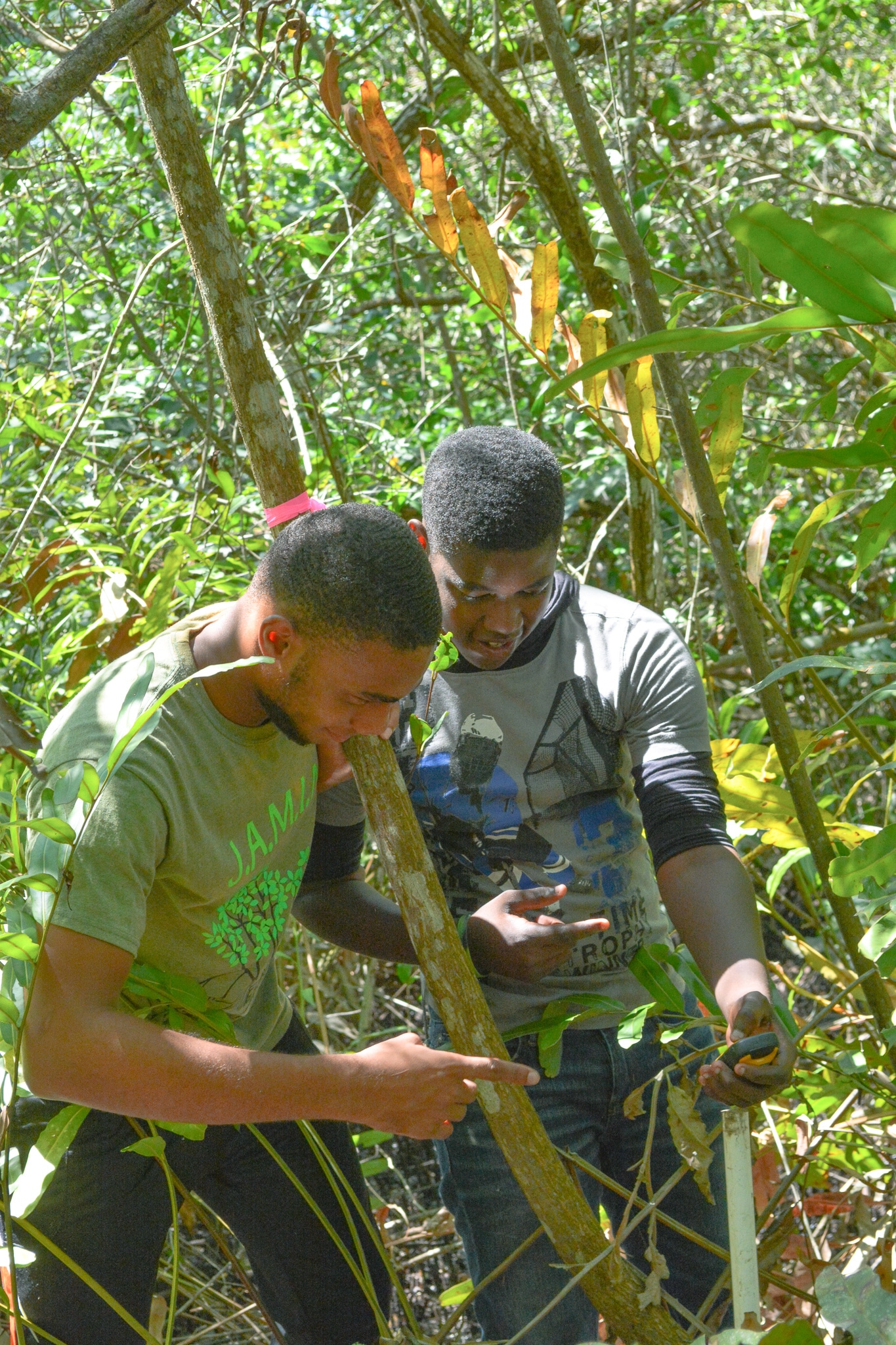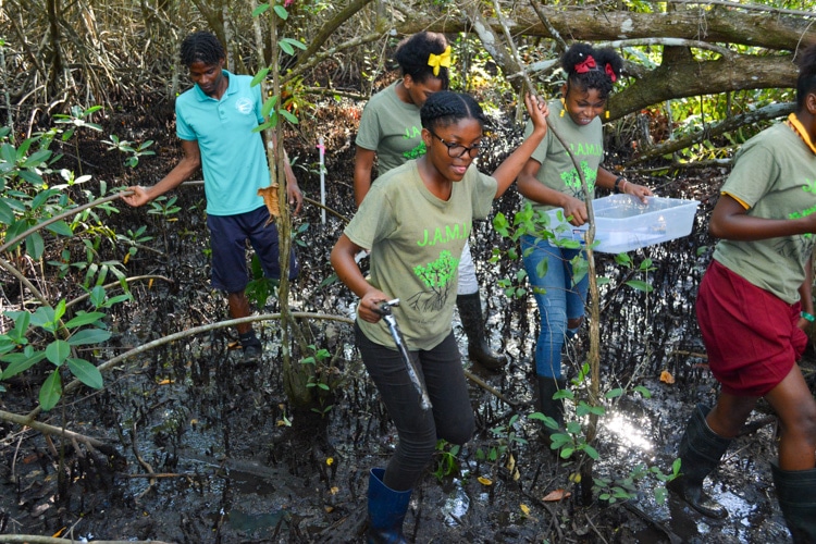 Giggles, chatter, and the sound of squeaking rubber boots echoed through the mangrove forest surrounding Alligator Head Foundation, where second-year J.A.M.I.N. students from Port Antonio and Titchfield High Schools trudged through the thick mangrove mud to reach their square quadrats. Inside the quadrats, they used scientific equipment to collect data for a variety of environmental parameters such as salinity, dissolved oxygen, and mangrove tree height. They also gathered red mangrove leaves that contain necrotic (dead) tissue. The students later conducted an investigation to see if these leaves contained the presence of a disease-causing fungus. More on that later.