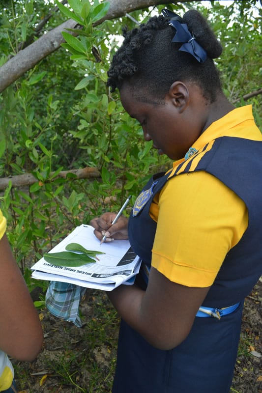 Marcus Garvey Technical School: Biology grade 10 student from Marcus Garvey Technical School draws the mangrove leaves in her mangrove journal.