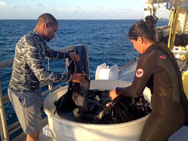 Today was a busy day: three dives and – finally – calm enough seas to launch the Twin V with Steve Schill’s sidescan sonar. The original plan was to do one dive, then stop by Middle Cay and ask the local fishermen for their thoughts on where to find good, protected patches of coral. But the visit was postponed after a fishing boat swung by the Calcutta as we were loading supplies and suggested a few locations on the spot. The crew of the Golden Shadow was happy to fill up their water container. Since the islands have no water sources besides rainfall, fresh water becomes currency out here, like a real-life version of the movie Waterworld.