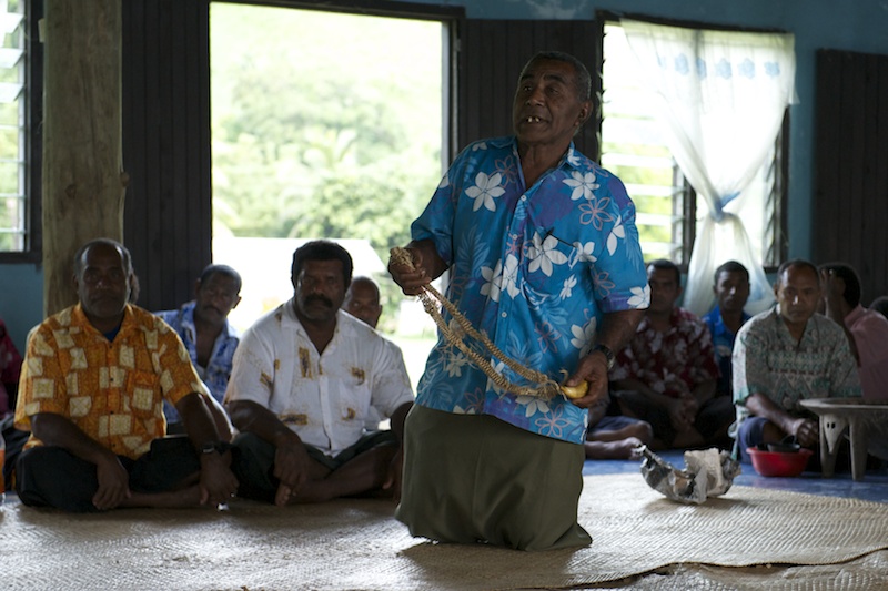 Community members from Totoya Island watch as a sperm whale’s tooth (tabua) is presented as a formal offering for the establishment of Daveta Tabu, a locally managed MPA. (c) Keith Ellenbogen