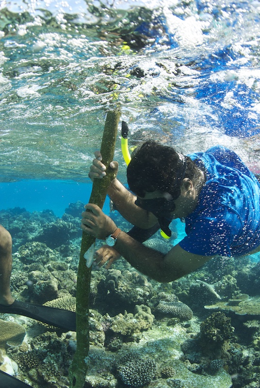 Roko Sau, Josefa Cinavilakeba, places a tree trunk in the reef on Totoya to mark the boundary of a locally managed MPA. (c) Keith Ellenbogen