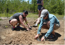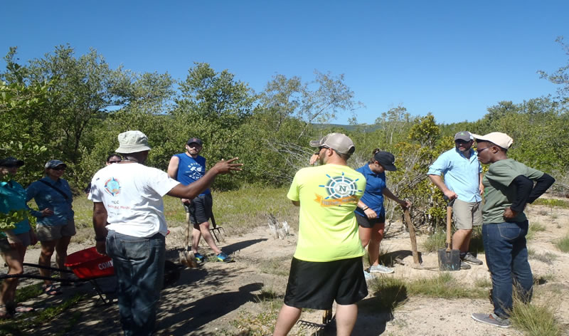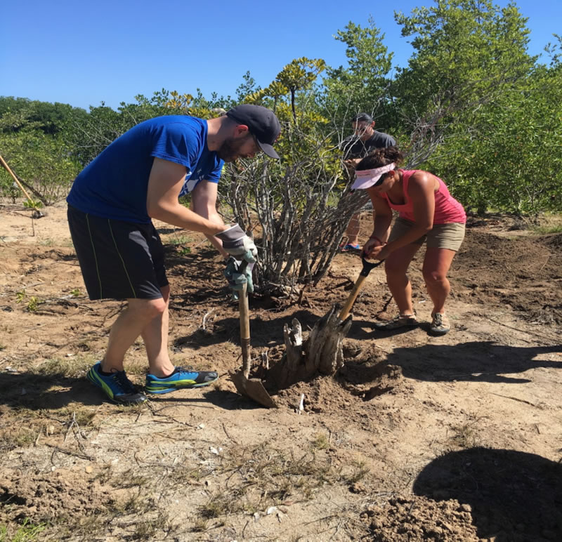 Amy and Mr. Trench explained our goal for the day: restore a small site containing a large mound that was obviously impacting the hydrology of the area.  While the tidal waters where only feet away at high tide, the mounds created by the charcoaling activity restricted water movement and it was our goal to fix it!  Armed with a couple shovels, rakes, a pick-ax, and wheelbarrow, we hashed out a plan and began removing invasive vegetation and excess soil.  In the next few hours we made our mark on that small swath of ground and returned it back to it’s natural elevation.  Finally, we carefully planted the mangrove propagules that Mr. Trench had grown back at the lab.