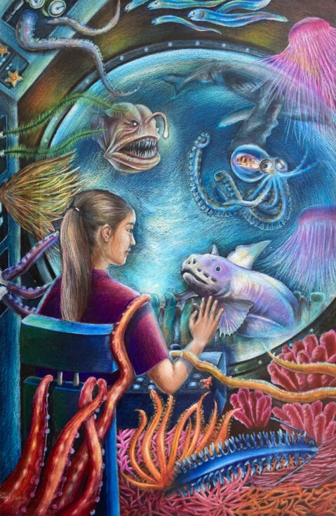 Artist’s Statement: My artwork depicts a deep-sea ecosystem that contains snailfish, bioluminescent jellyfish, anglerfish, reefs, whale fall, squid, eel, and marine worms. There is a person exploring inside a deep-sea submersible, which exhibits the methods humans utilize to unveil the mysteries of the deep. The fascinating deep-sea organisms are located inside and outside of the deep-sea submersible. This represents how humans and the creatures of the deep sea are both on Earth but are barred from interaction due to their extremely different environments. Furthermore, my artwork illustrates a person inside the submersible closely observing a snailfish, which was recently discovered to be the deepest living fish. This represents that although the deep sea is mostly unexplored, more hidden wonders of the intriguing ecosystem are gradually being brought to light.