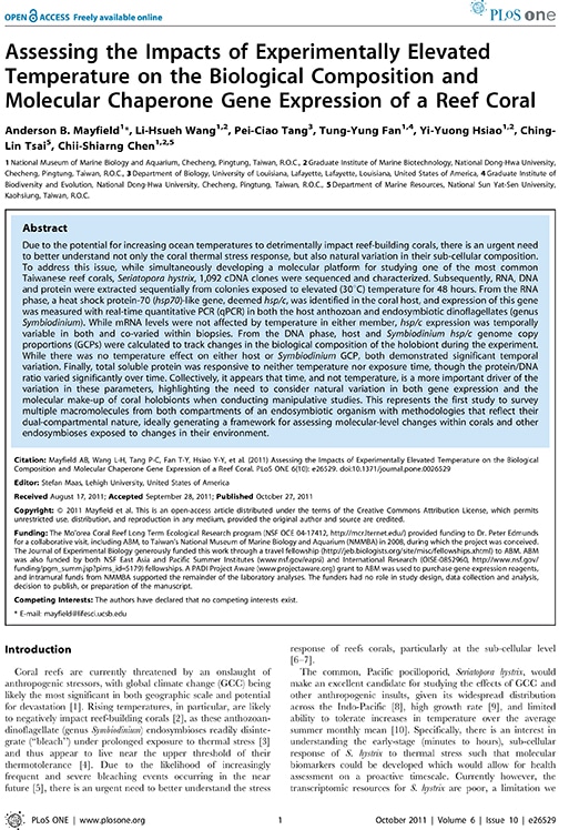 Due to the potential for increasing ocean temperatures to detrimentally impact reef-building corals, there is an urgent need to better understand not only the coral thermal stress response, but also natural variation in their sub-cellular composition. To address this issue, while simultaneously developing a molecular platform for studying one of the most common Taiwanese reef corals, Seriatopora hystrix, 1,092 cDNA clones were sequenced and characterized. Subsequently, RNA, DNA and protein were extracted sequentially from colonies exposed to elevated (30uC) temperature for 48 hours. From the RNA phase, a heat shock protein-70 (hsp70)-like gene, deemed hsp/c, was identified in the coral host, and expression of this gene was measured with real-time quantitative PCR (qPCR) in both the host anthozoan and endosymbiotic dinoflagellates (genus Symbiodinium). While mRNA levels were not affected by temperature in either member, hsp/c expression was temporally variable in both and co-varied within biopsies. From the DNA phase, host and Symbiodinium hsp/c genome copy proportions (GCPs) were calculated to track changes in the biological composition of the holobiont during the experiment. While there was no temperature effect on either host or Symbiodinium GCP, both demonstrated significant temporal variation. Finally, total soluble protein was responsive to neither temperature nor exposure time, though the protein/DNA ratio varied significantly over time. Collectively, it appears that time, and not temperature, is a more important driver of the variation in these parameters, highlighting the need to consider natural variation in both gene expression and the molecular make-up of coral holobionts when conducting manipulative studies. This represents the first study to survey multiple macromolecules from both compartments of an endosymbiotic organism with methodologies that reflect their dual-compartmental nature, ideally generating a framework for assessing molecular-level changes within corals and other endosymbioses exposed to changes in their environment.