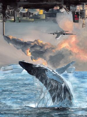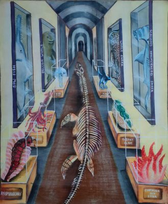 In the 15-19 age group, the first-place winner in the 2023 Science Without Borders® Challenge is Boram Shim with her stunning artwork, We Are Next. A 16-year old student in Norwood, New Jersey, Boram’s captivating piece depicts a number of endangered marine species, including a Kemp’s ridley sea turtle and the critically endangered vaquita porpoise. With a thought-provoking approach, the artwork depicts the history of animal extinction, emphasizing that if we continue to harm the environment, we ourselves may face extinction, much like the mammoths, ammonites, and dinosaurs. The artwork powerfully reminds us that we must act urgently to prevent this dire fate.