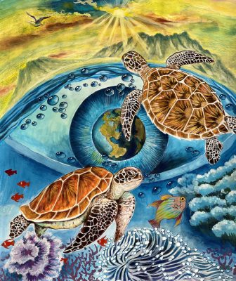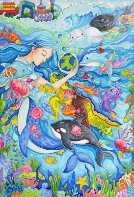 In the 11-14 age group, Yanjun Mao, a 14-year-old student from China, emerged as the first-place winner for his artwork titled The Sea Bears Witness to Everything. Yanjun’s artwork captures the hawksbill sea turtle, a species on the verge of extinction, swimming in front of a tearful eye in the ocean. He says this signifies the ocean’s witness to the history of the hawksbill sea turtle as well as the heartbreaking killing of hawksbill sea turtles by humans. The artwork conveys the importance of protecting marine life while offering hope for a better future. By participating in the contest, Yanjun says he learned about the ocean’s importance to people and their role in caring for nature. Now, he says, “I am willing to work for the protection of the ocean.”