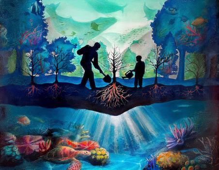 Yeonjae’s winning piece of artwork shows the importance of reforestation in conserving coral reefs. “The roots of trees act as forest buffers and help prevent pollution from entering the water by stabilizing the sediment,” she said. “The depiction of a father and son planting a young tree represents a hopeful future where the current generation can hold hands with the next generation to save the ocean.”