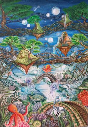 First place in the category for students 11-14 years old went to 11-year-old Amy Hyobin Pyo, a student at Tenafly Middle School and Studio YM in New Jersey. Her piece, Coral Reef in the Bosom of their Mother, shows how coral nurseries can be an important tool in coral reef conservation. Amy said she wanted to use her artwork to “send a message to the world that corals are in danger, and how people are saving them.” She hopes her artwork inspires people to help coral reefs in their daily lives.