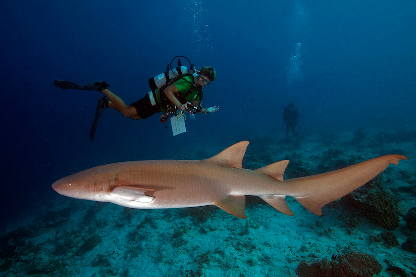 Curious Tawny Nurse Shark (Nebrius ferrugineus) swims by several scientists and gives Anderson Mayfield a close pass. -
