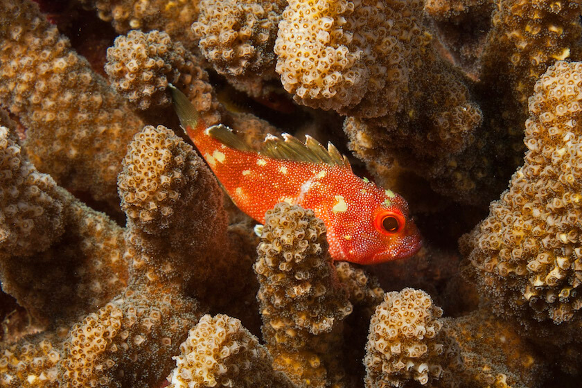 Yellow-spotted Scorpionfish (Sebastapistes cyanostigma) hiding among the branches of a Pocillopora coral. -