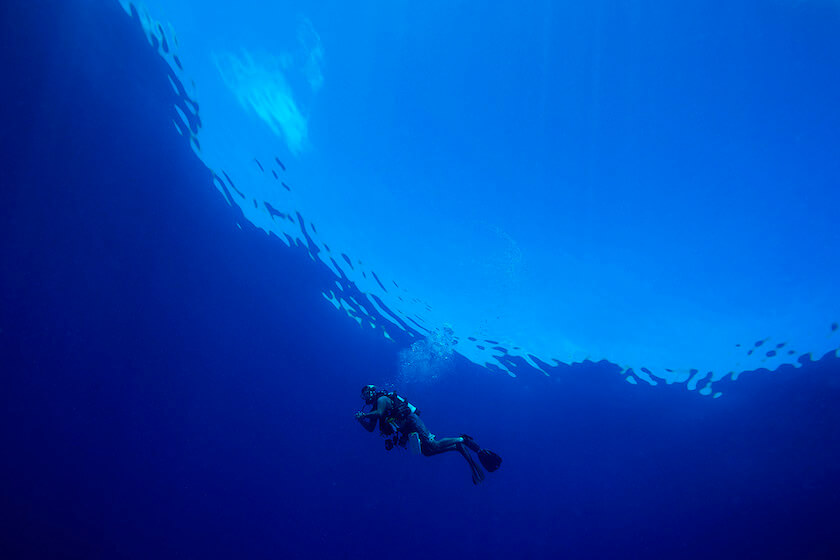 Anderson Mayfield during a safety stop at the end of a dive under the ceiling of a glassy calm sea. -