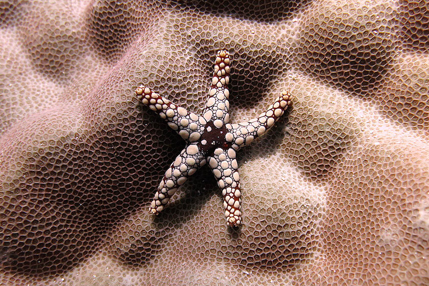�3Cfigcaption class=”blocks-gallery-item__caption”>A noduled sea star (Fromia nodosa) sits atop a Porites colony. -