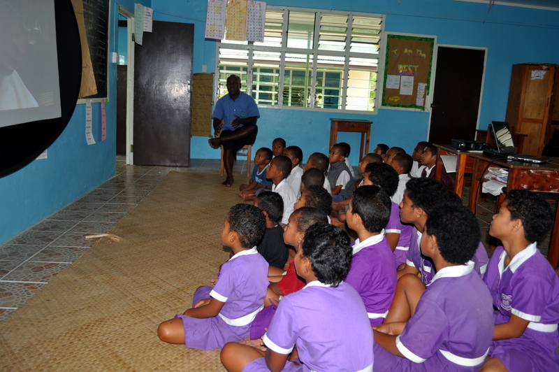 Roko Laitia Raloa, Protocol Officer at the Lau Provincial Council’s Office, and I are greeted at the boat tender by the principal of the primary school to which we are presenting our coral reef education program. Walking up to the village, we are welcomed by loud, harmonious singing pouring out of a school classroom. They continue to sing as we remove our shoes, enter the classroom, and take a seat. It’s been the same procedure as the twelve schools prior to this one, but I’m still smiling from ear to ear and the loudness and clarity of the singing never ceases to amaze me.