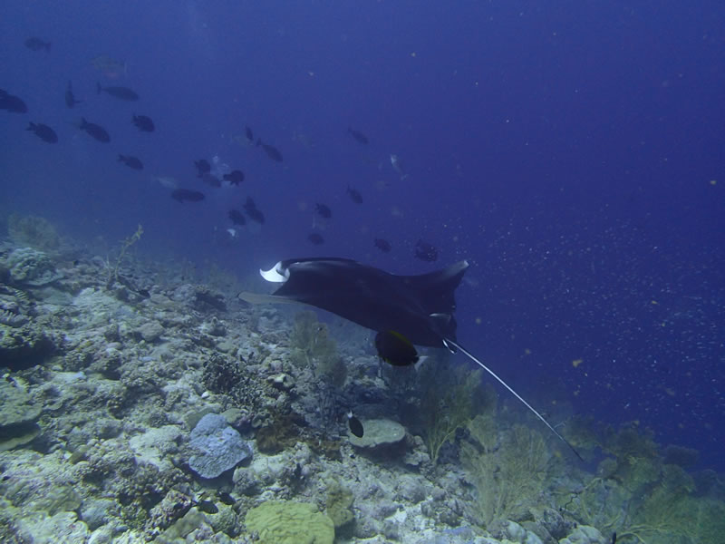 The science team is always eager to see rays during any dive, and diving in the British Indian Ocean Territory (BIOT) hasn’t disappointed us when it comes to majestic ray encounters. During our first day of diving, a group of Living Oceans Foundation scientists were approached by an inquisitive and enormous reef manta ray (Manta alfredi). By day three our manta ray count was already up to five individuals, and we continue to see them throughout the lagoon, fore reef, and channel dives.