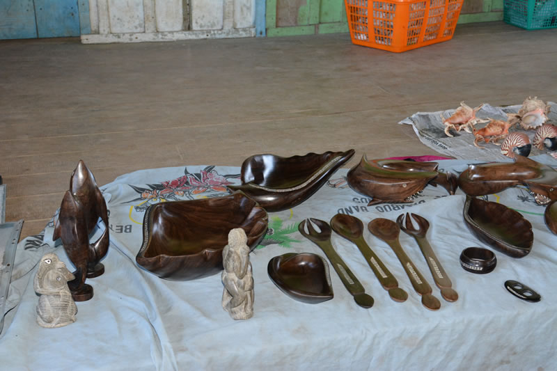 Our first coral reef seminar was set to take place in Bareho Village. When we arrived at the community hall, we were pleasantly surprised to see that they had set up a “carving show” for us. A carving show is a way to bring all of the wood carvers of the village to one area to sell their products. We saw many beautiful carvings. Then we met a gentleman named Aldio Pita. He was selling something altogether different, paper prints.