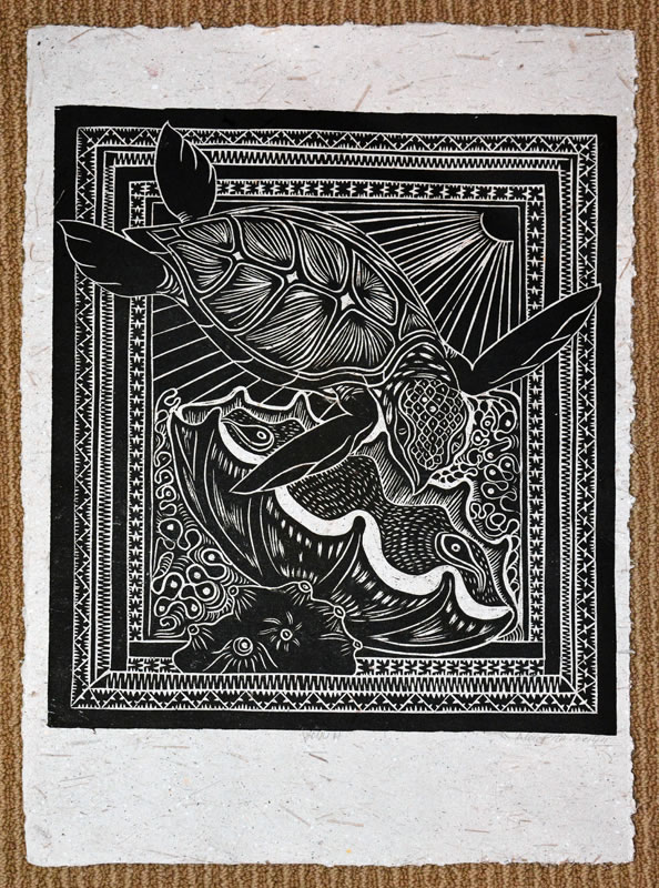 At least half of the prints that Aldio creates have an ocean theme. His passion for the environment is reflected in his artwork. He includes many creatures from the ocean including different types of fish, giant clams, crabs, octopuses, lobsters, and many more.