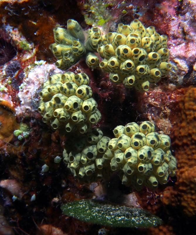 Some of the smaller, spectacularly colored social and colonial tunicates have also been common on leeward reefs.