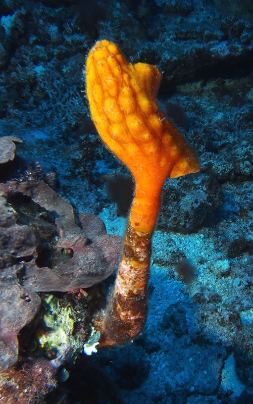 On our dives, one encrusting tunicate (Lissoclinum) has been unusually common, often covering large areas of reef and growing over dead corals. This species is greenish in color due to a symbiotic single-celled “algae” (prokaryote) called Prochloron.