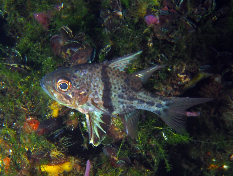 An orbiculate cardinalfish, Sphaeramia orbicularis (left) / A clump of the fragile sponge Haliclona hanging off a mangrove root (right)