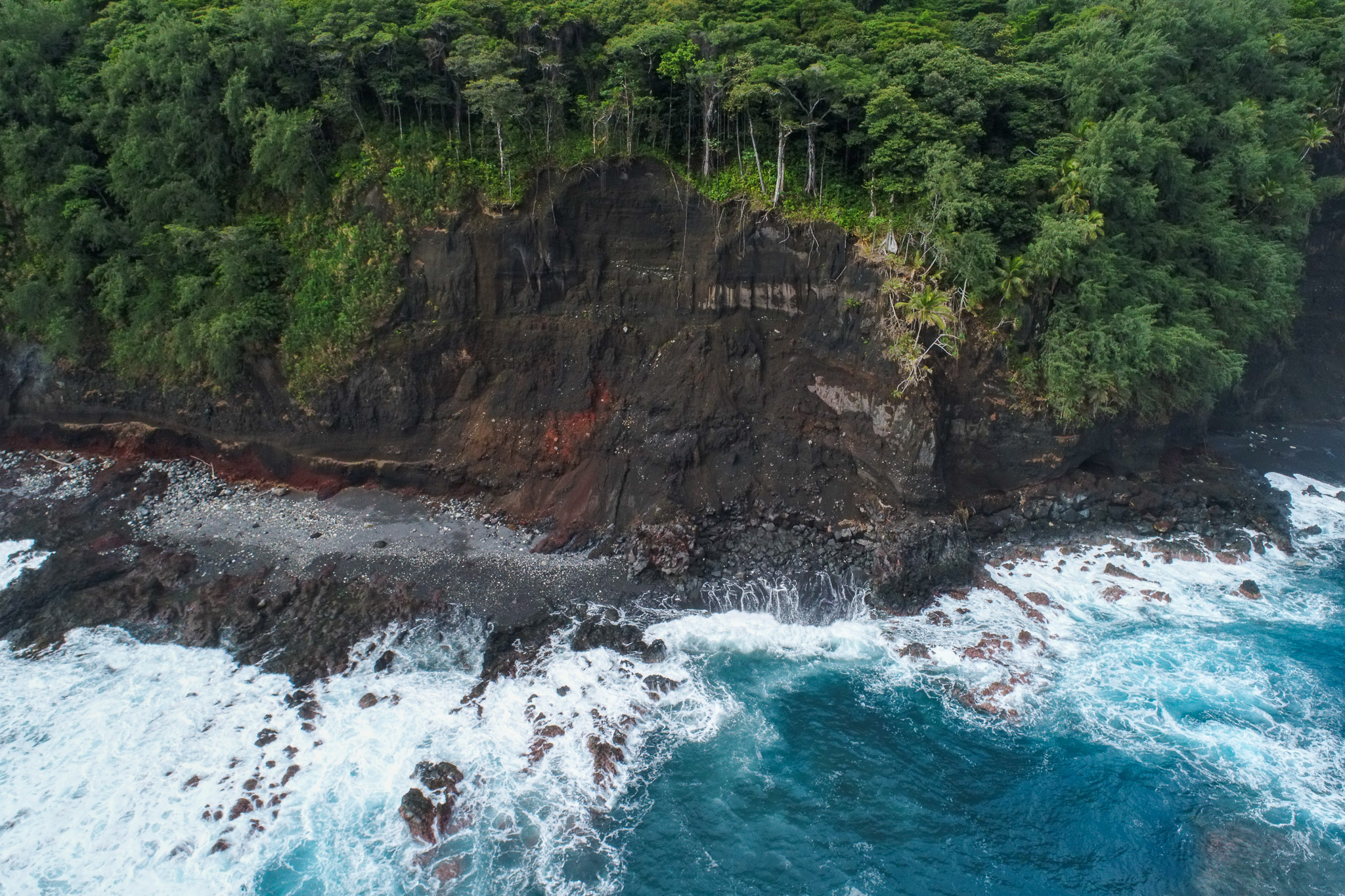 Drone shots showing the damage to the coastline Tofua, the island in Tonga which received the largest tsunami wave. Image courtesy of co-author, Dr. Shane Cronin (University of Auckland).