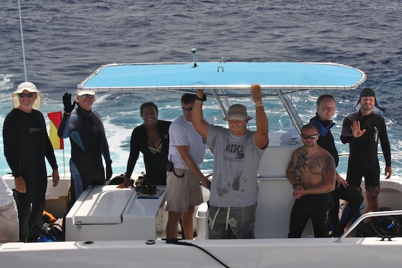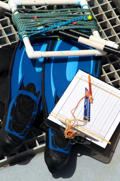 After lunch, the first group of scientific divers departed for the dive site and began sampling and surveying. Throughout the afternoon’s dives, the research divers were pleased to find healthy corals, representative fish populations and few signs of overfishing or damage from boat anchors. Because the Inaguas are relatively isolated and support a small population of people (less than 2000 individuals), the man-made impacts and pressures that are all too common on many reefs are not immediately apparent here.