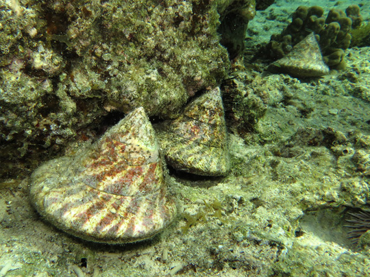 The French Polynesian scientists participating on the Society Islands mission took the opportunity to quantify the abundance of a number of French Polynesia invertebrates… species that have, or may have, a commercial and food subsistence role in the near future. In particular, they investigated the abundance of a number of sea cucumbers species, giant clams (only Tridacna maxima is found everywhere in French Polynesia) and also the imported green snails, Turbo marmoratus and Trochus niloticus. Trochus snails were brought to Tahiti from Vanuatu nearly 50 years ago, and then transplanted to selected islands throughout French Polynesia.