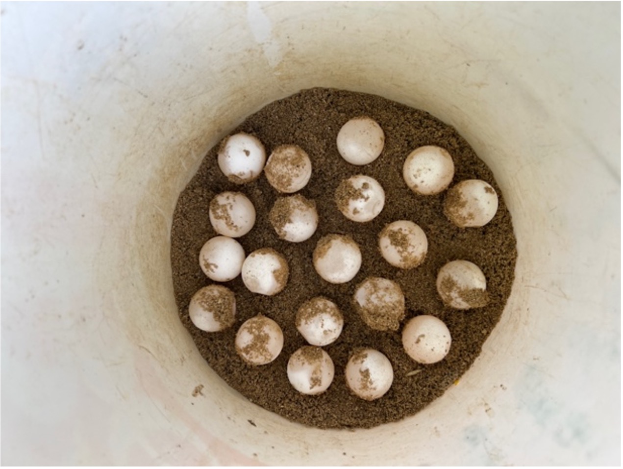 We count 105 eggs in total, mark the GPS location, and measure the depth of the nest. The eggs will be taken to the Alligator Head Foundation, where they will be placed in sterilized incubators. Using gloves, I gently place each egg in the bucket in the reverse order that they were in the nest, so that when they are relocated to the incubator, the eggs are in the same position that they were laid.