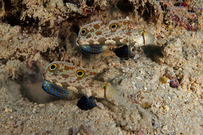 Over the next few minutes I started to see a pattern in their behavior. They paused for a moment near their burrow under a cluster of green Urn Tunicates (Atriolum robustum) whenever a larger fish swam by overhead. They would occasionally swim forward and backward in an erratic manner. This characteristic behavior (along with the two ocellated spots on their dorsal fins) is what has caused some to call them Crab-eyed Gobies for this possible mimicry. The vertical line running down their face and through their “true” eyes aids in this deception—a marking shared by many butterflyfishes which also sport large ocellated “eye” spots on their bodies. I watched them make a circuit with several stops along the way, always returning to their burrow for a moment or two before setting out on the next lap. Whenever they stopped they would bend down and suck up a mouthful of sediment. This sandy sediment was then sifted through their gill rakers searching for small benthic invertebrates that live within the sediment which are their primary food source. As they swim they generally fold their fins down for reduced drag but when they stop they raise their twinspotted dorsal fins and extend their anal and pelvic fins which are dark with brilliant electric blue spots adding to their charm.