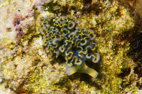 Even though the rest of the expedition is being cancelled, it is not over. Dr. Judy Lang wanted to share her “Friend of the Day!” One of Judy’s favorite reef organisms is the Lettuce Sea Slug (Elysia crispata (formerly Tradachia)). Sea slugs are in the phylum mollusca (soft-bodied) organisms that have a mantle that secretes a shell and move around on a muscular foot. However, a unique thing about sea slugs is that they are gastropods (snails) that lack a shell. As you can see in the photo below, the Lettuce Sea Slug has beautiful “ruffles” that form a double row along its dorsal (back) surface that come in a variety of ruffles depending upon the color of the algae upon which they forage. Judy’s favorite thing about the Lettuce Sea Slug is that it incorporates the chloroplasts (cells that aid the algae in photosynthesis) into its own tissues. This allows the Lettuce Sea Slug to convert light energy into chemical energy (sugars), supplementing its diet for a short while.