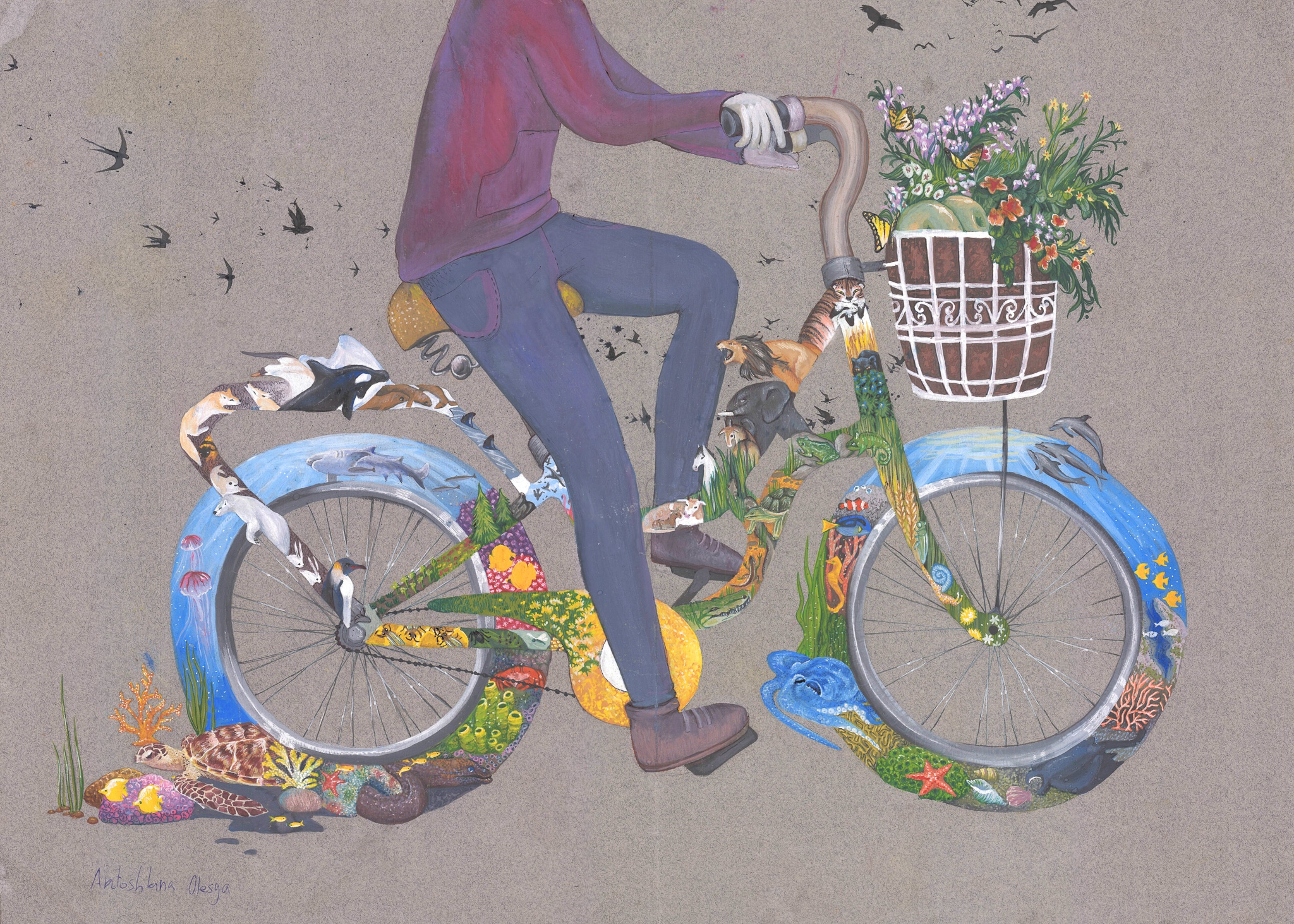 Lesya Antoshkina from Ukraine is the winner of the high school category for her stunning artwork “The Bike We Ride,” which beat out fierce competition to take first place. Antoshkina lives in a small town near the sea of Azov. She loves the sea and said that she wants “to show nature’s problems through art.” With her piece, she aimed to convey that the Earth works “as one big mechanism,” and that as people, “we control the Earth, and we have to look after it.”