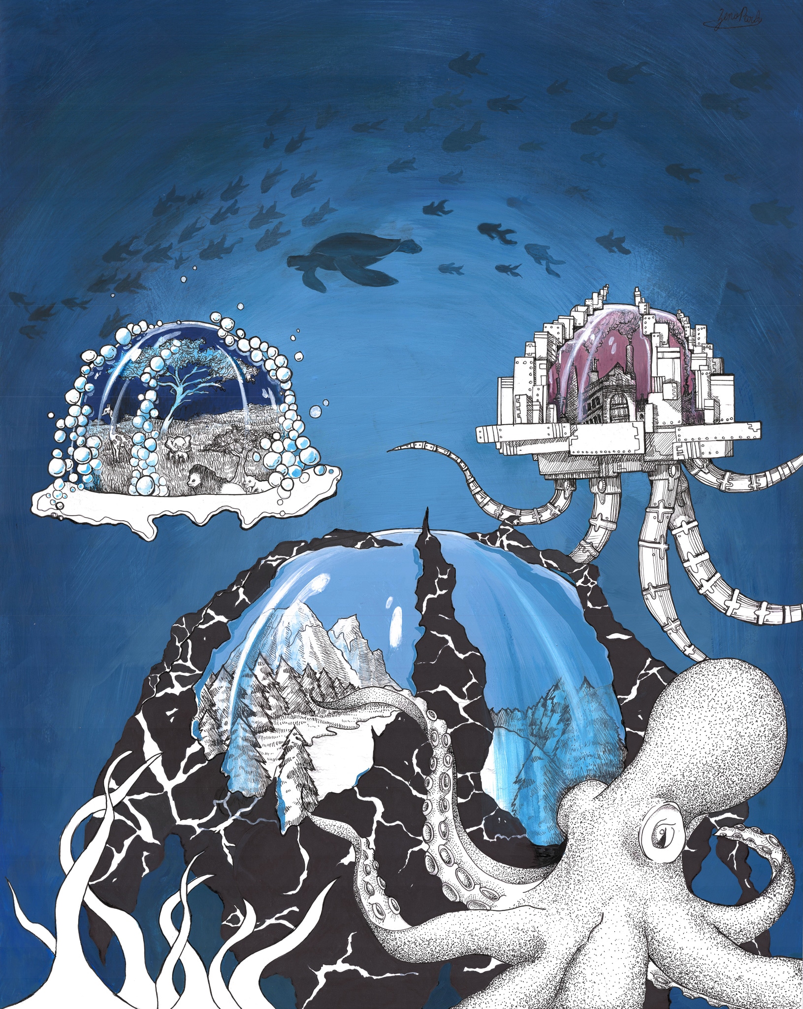 The winner in the middle school category is Zeno Park from New Jersey, who at only 12 years old created the winning entry “The Place Where Fish are Free to Roam.” With his imaginative piece of artwork, Park said he wanted to show that in the ocean, organisms are “free to go where ever they wish” but that life in his underwater islands is “heavily dependent upon the condition of their habitat.” Park said he was inspired to create this artwork “because the world is becoming polluted and ravaged. We might be forced to live in a difficult situation if we do not change our actions.”