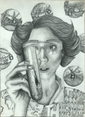 Stacey Lei won first place in the high school category of the 2020 Science Without Borders® Challenge for her stunning artwork, “The Reef We Read.” A 16-year old student at West Career and Technical Academy in Las Vegas, Nevada, Stacey created a piece of art that illustrates the importance of education and outreach in coral reef conservation. “Coral reefs are dying because of negative human activities,” she said. “The lack of awareness surrounding the reefs have contributed to its destruction, but education paves our future.”